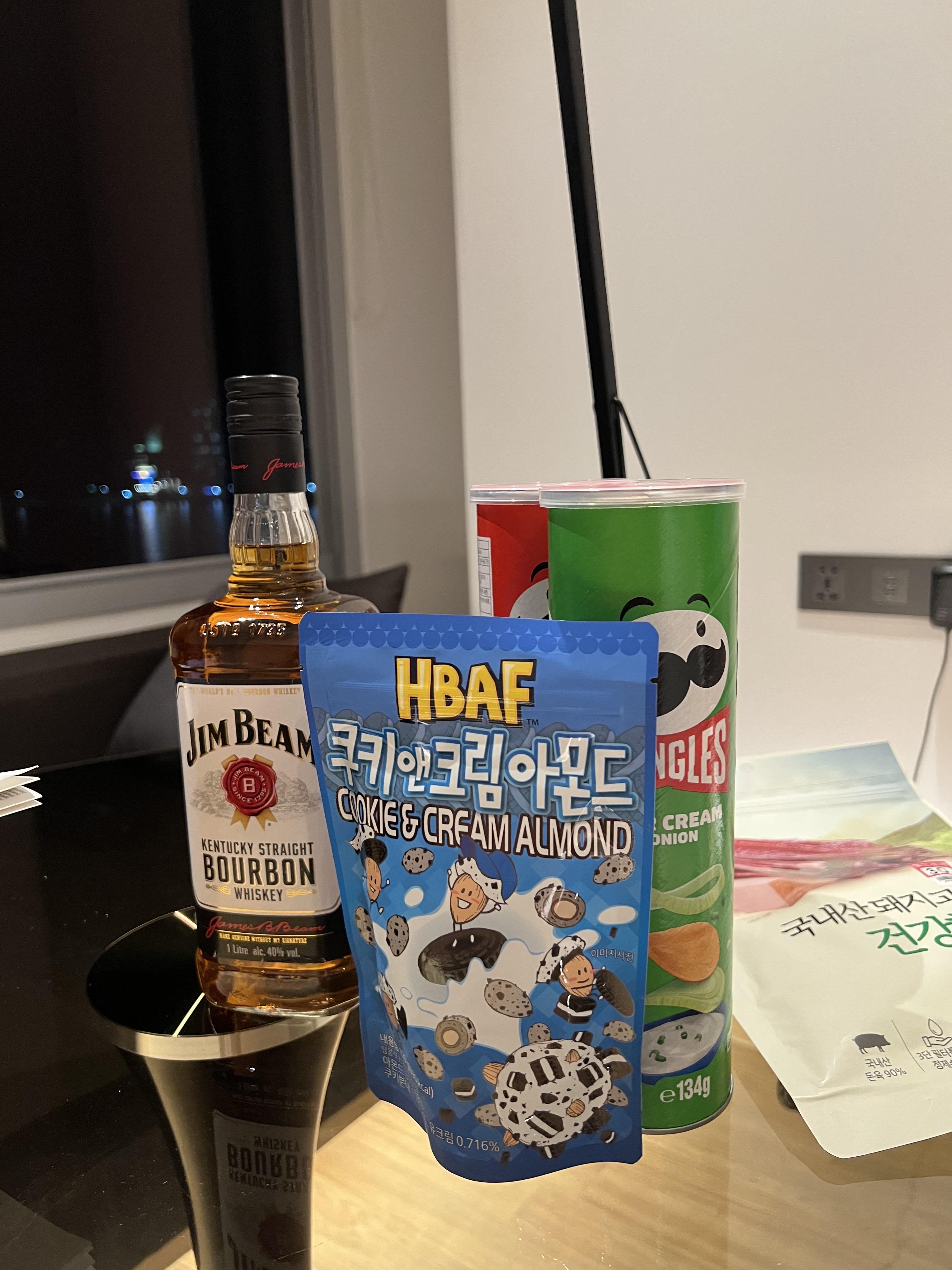 간단하게 하이볼과 바프 아몬드, 프링글스, 육포로 마무리~