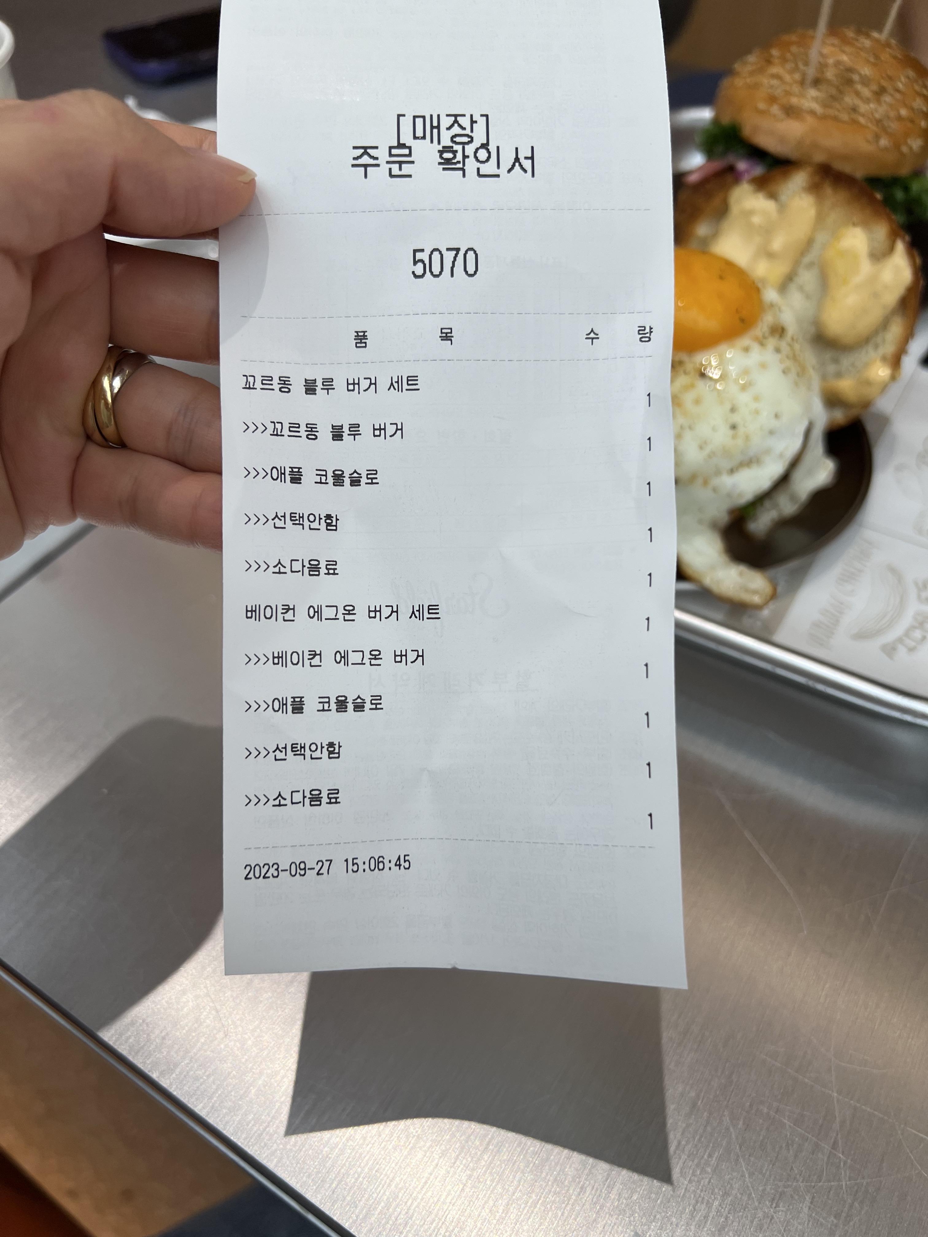 남편이랑 둘이 반씩 나누어먹자 했는데.. 저..는 위에 꼬르동블루버거 반개먹고 베이컨에그온은 1/4밖에 먹지 못함 ㅜ