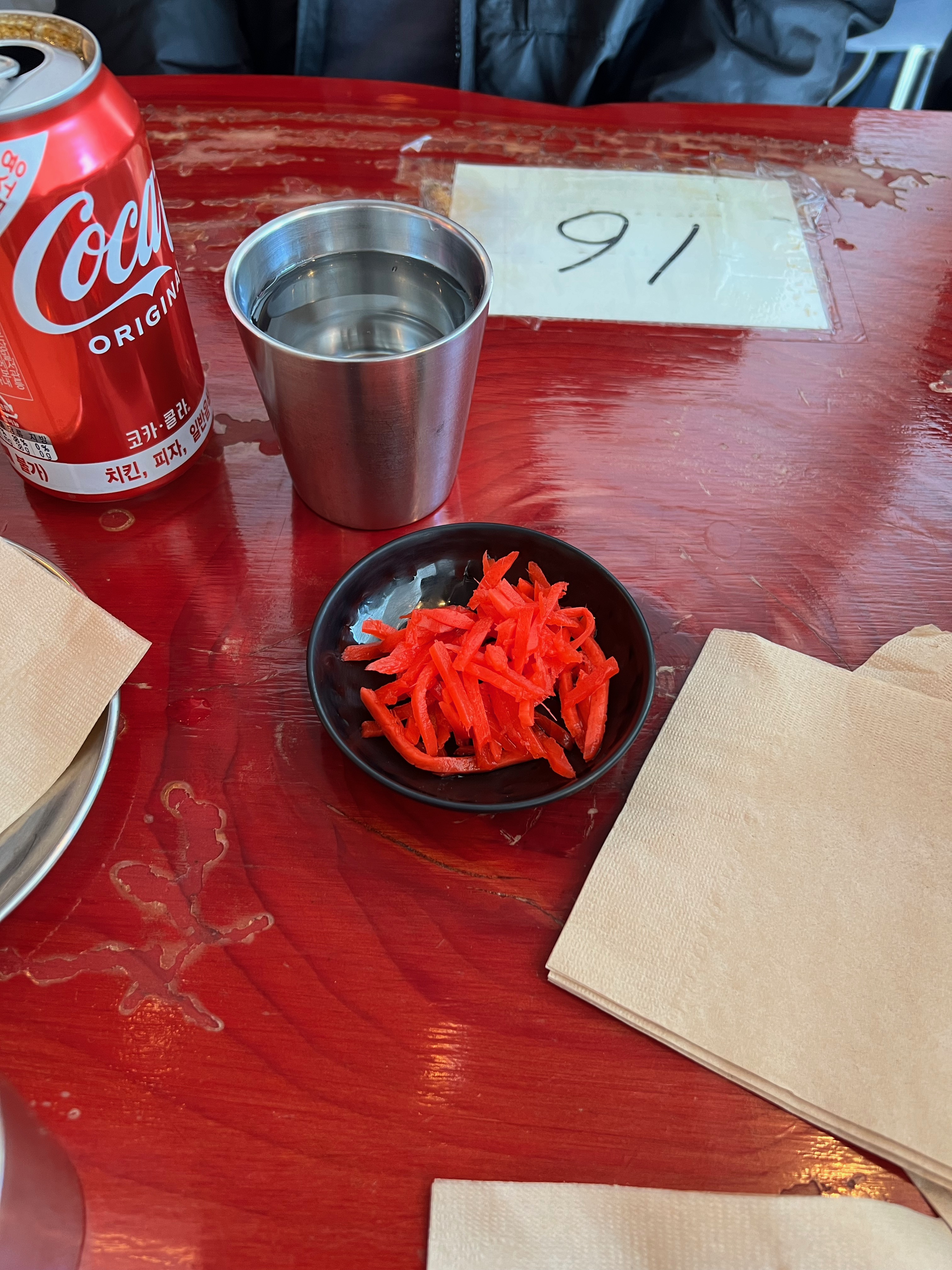 키오스크에서 주문하고 옆 셀프데스크에서 생강과 단무지를 챙길 수 있습니다.