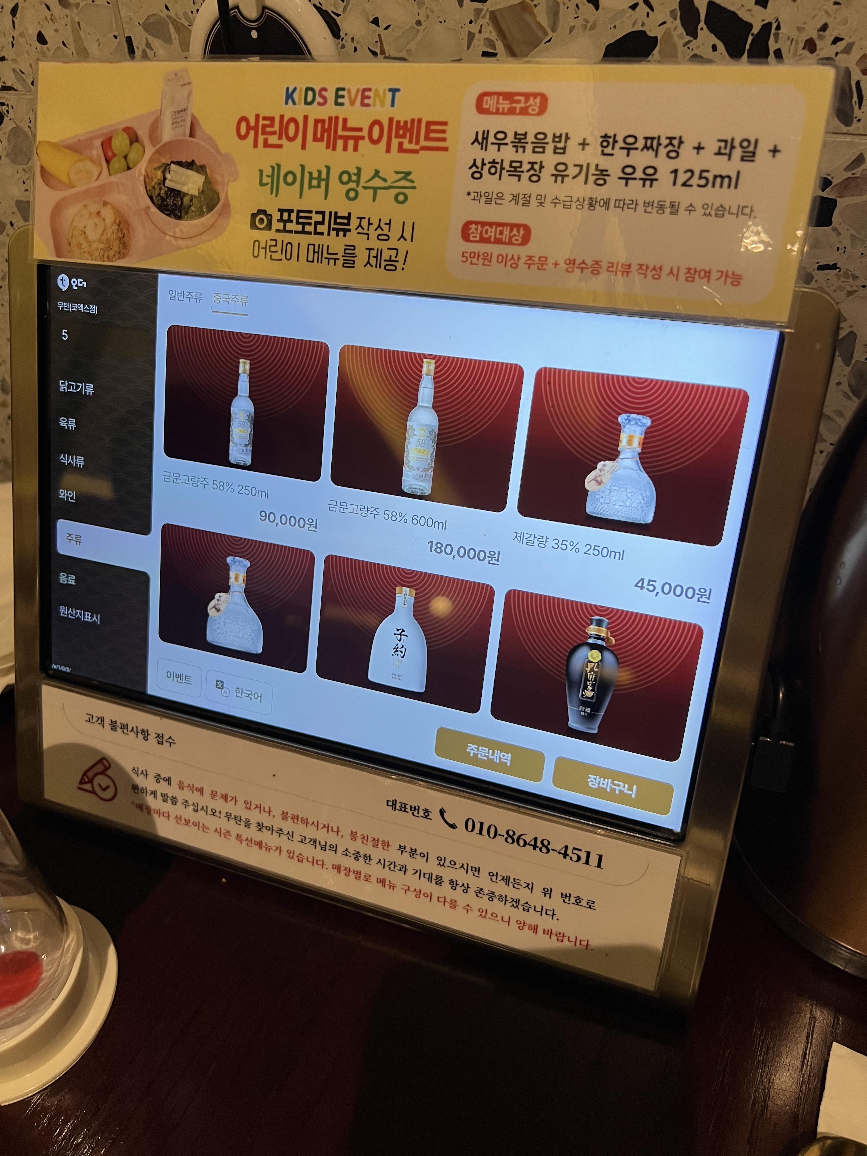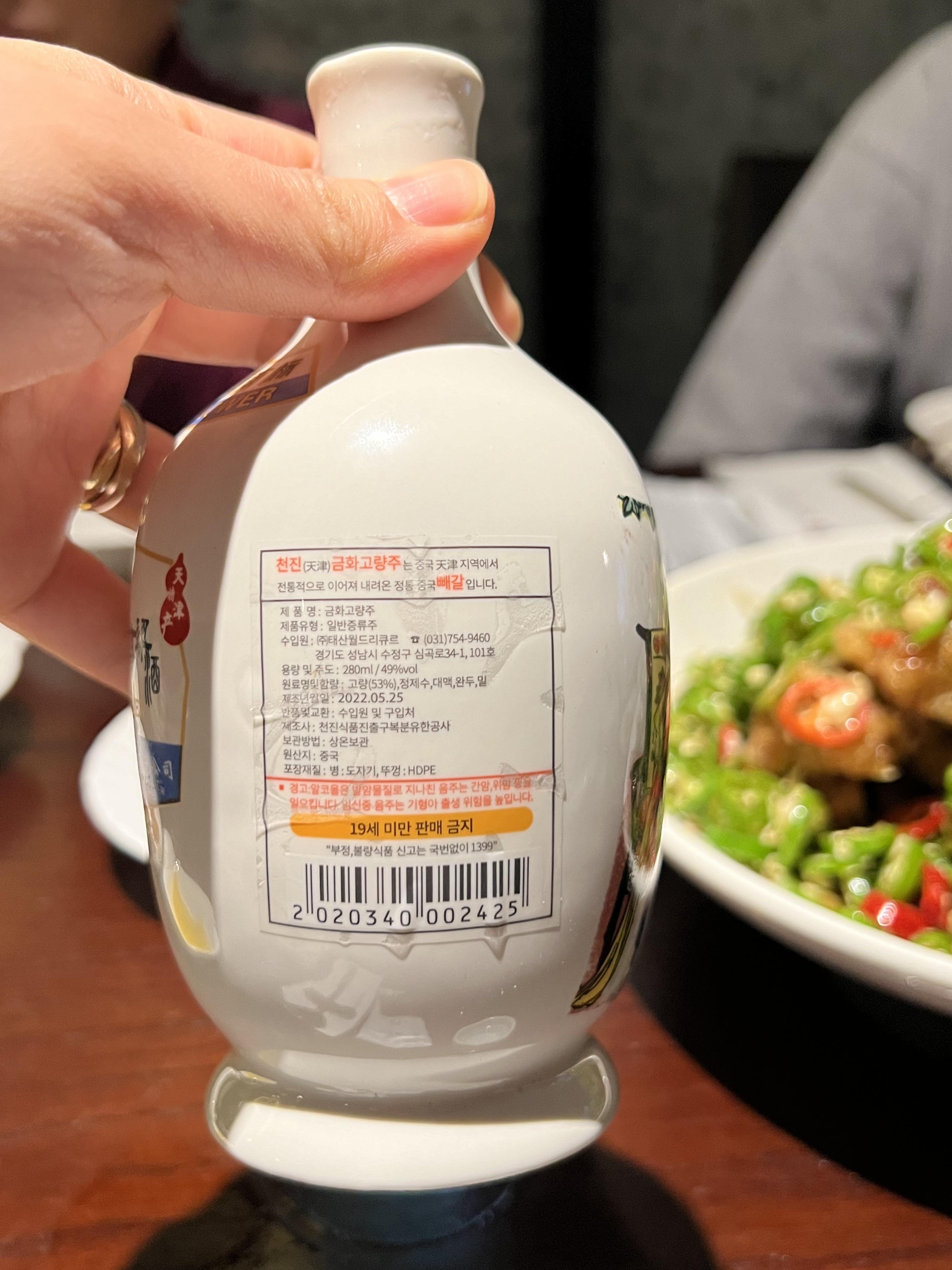우리가 주문한건 천진금화 고량주! 49도 이며 4만5천원