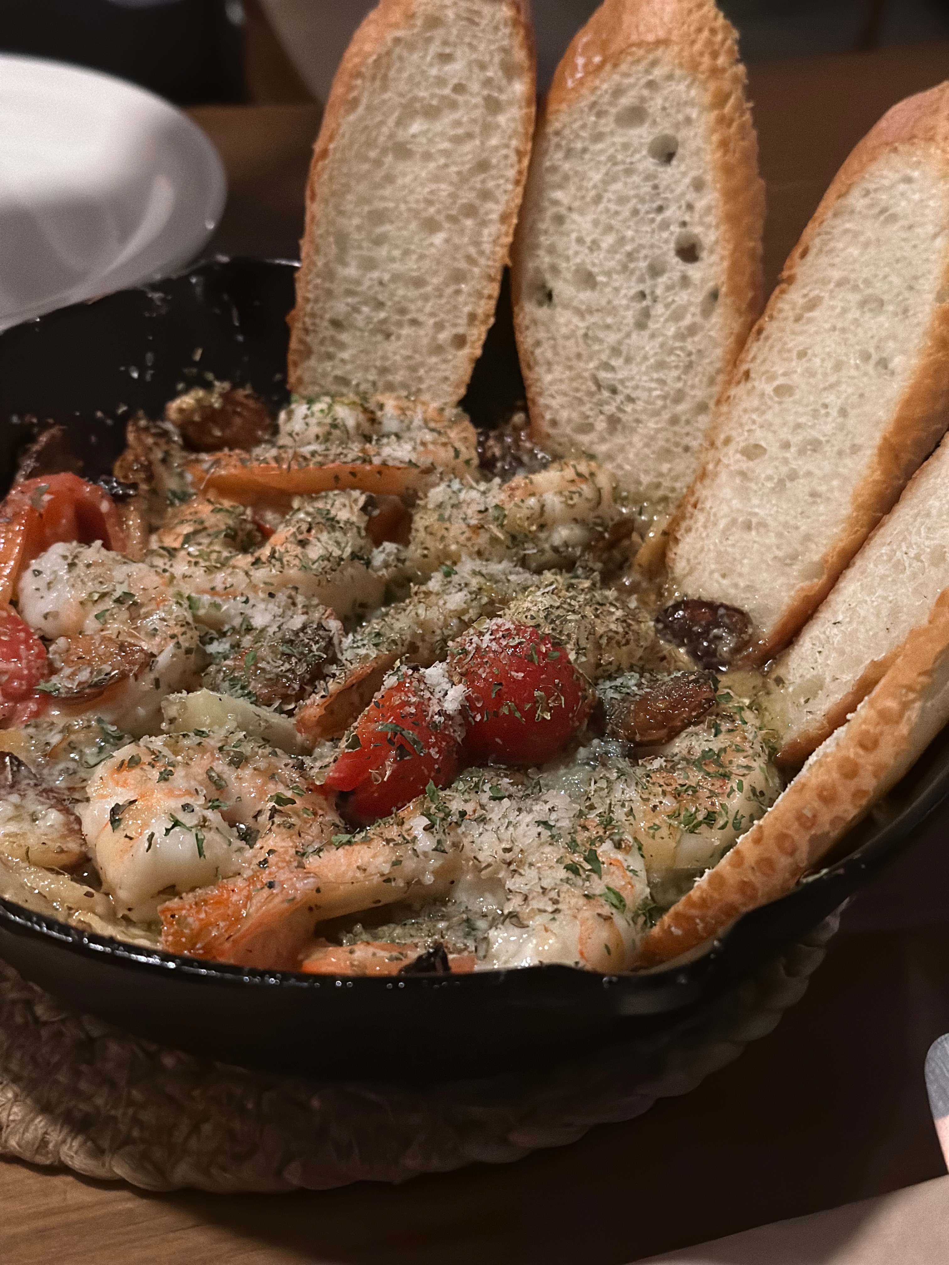 감바스는 큰 새우와 마늘, 페퍼론치노, 방울토마토, 바질, 월계수잎을 얼큰하게 끓여 만들어져 맛과 향의 조화를 만끽할 수 있어요.