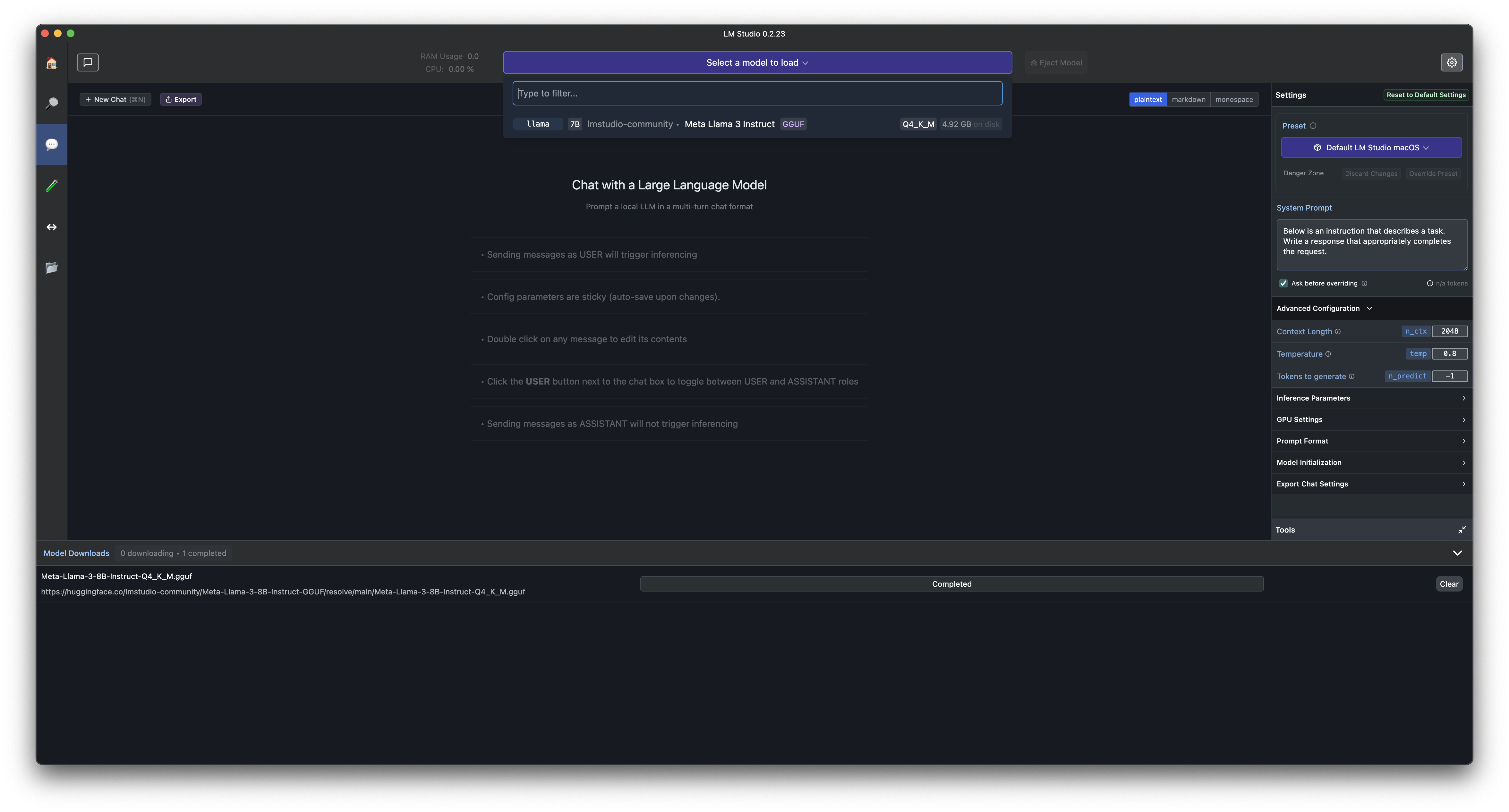 좌측의 AI Chat 메뉴로 이동해서 다운로드한 Llama 모델을 선택합니다.