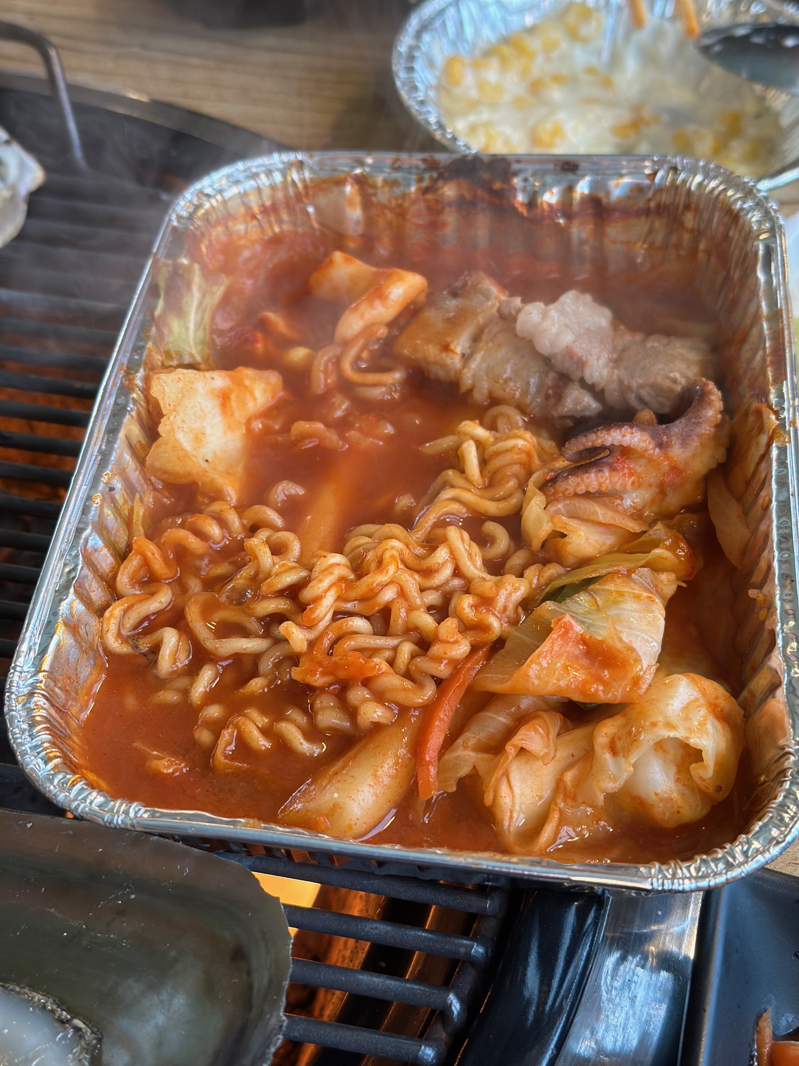 먼저 불위에 삼겹살, 라면, 콘치즈가 올라갑니다.