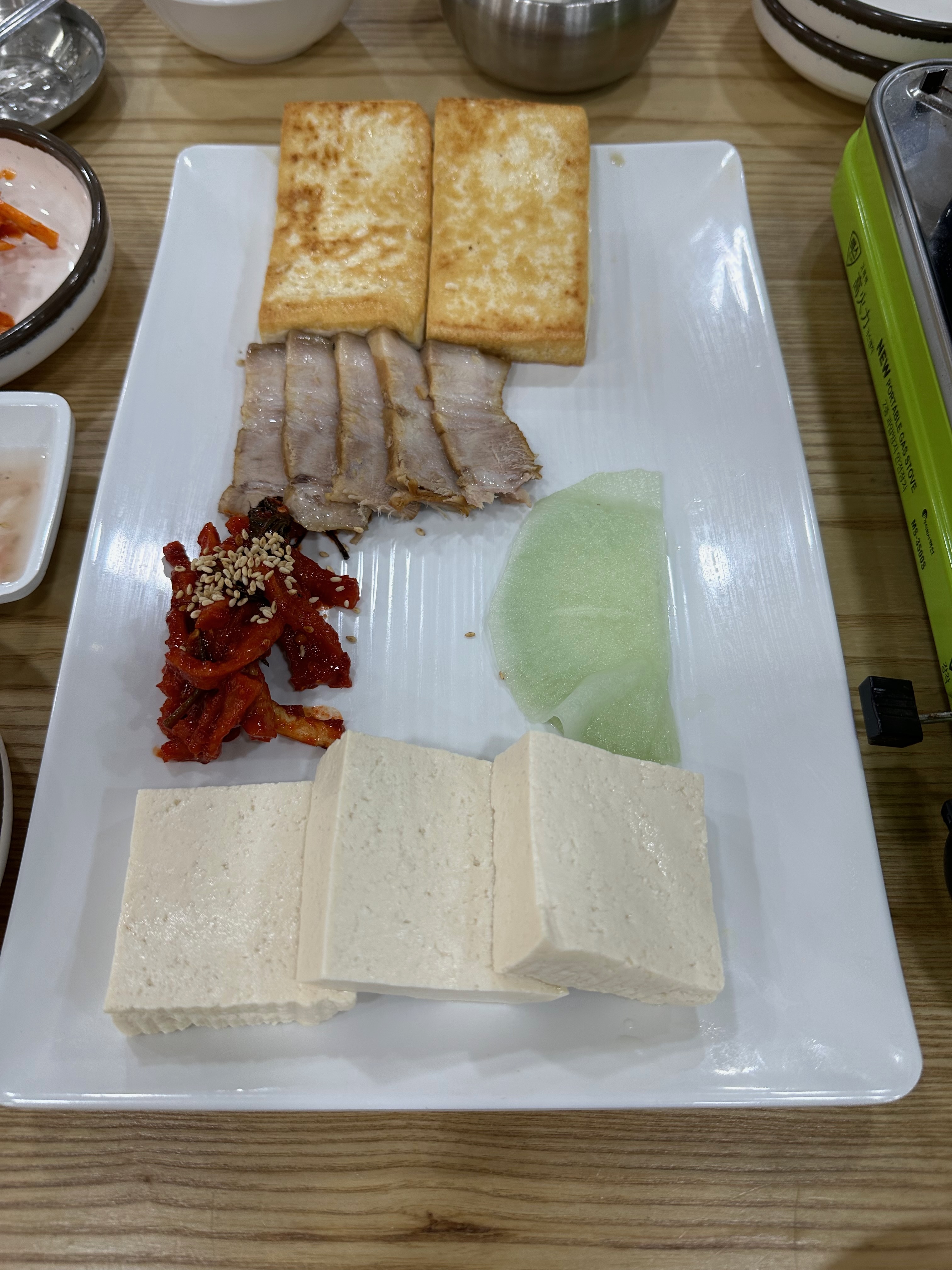 모두부 3조각, 두부부침 2조각, 보쌈고기 5점이 나오고
