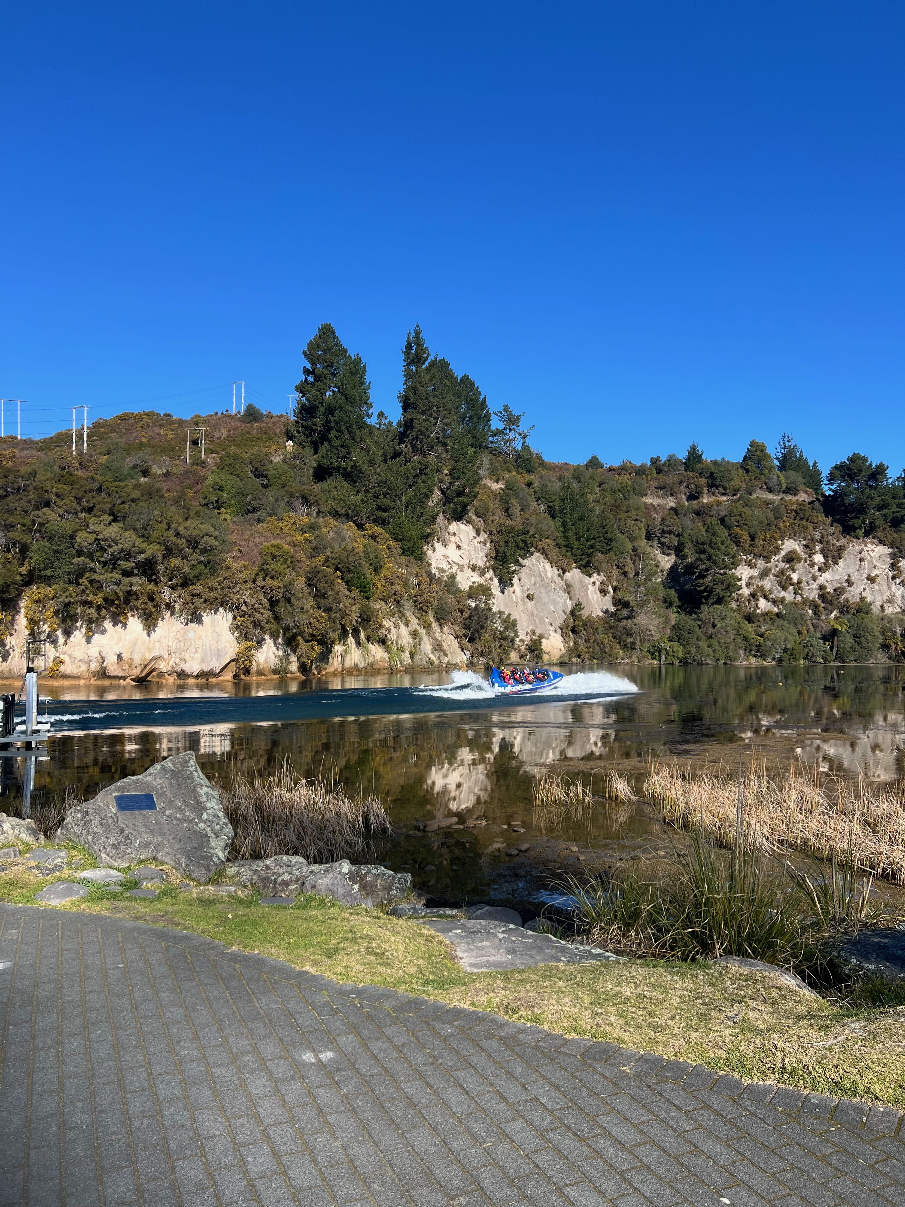 보트 소리가 나더니 저 멀리 와이카토 강에 빠르게 지나가는 후카 폭포 제트 보트가 보인다.