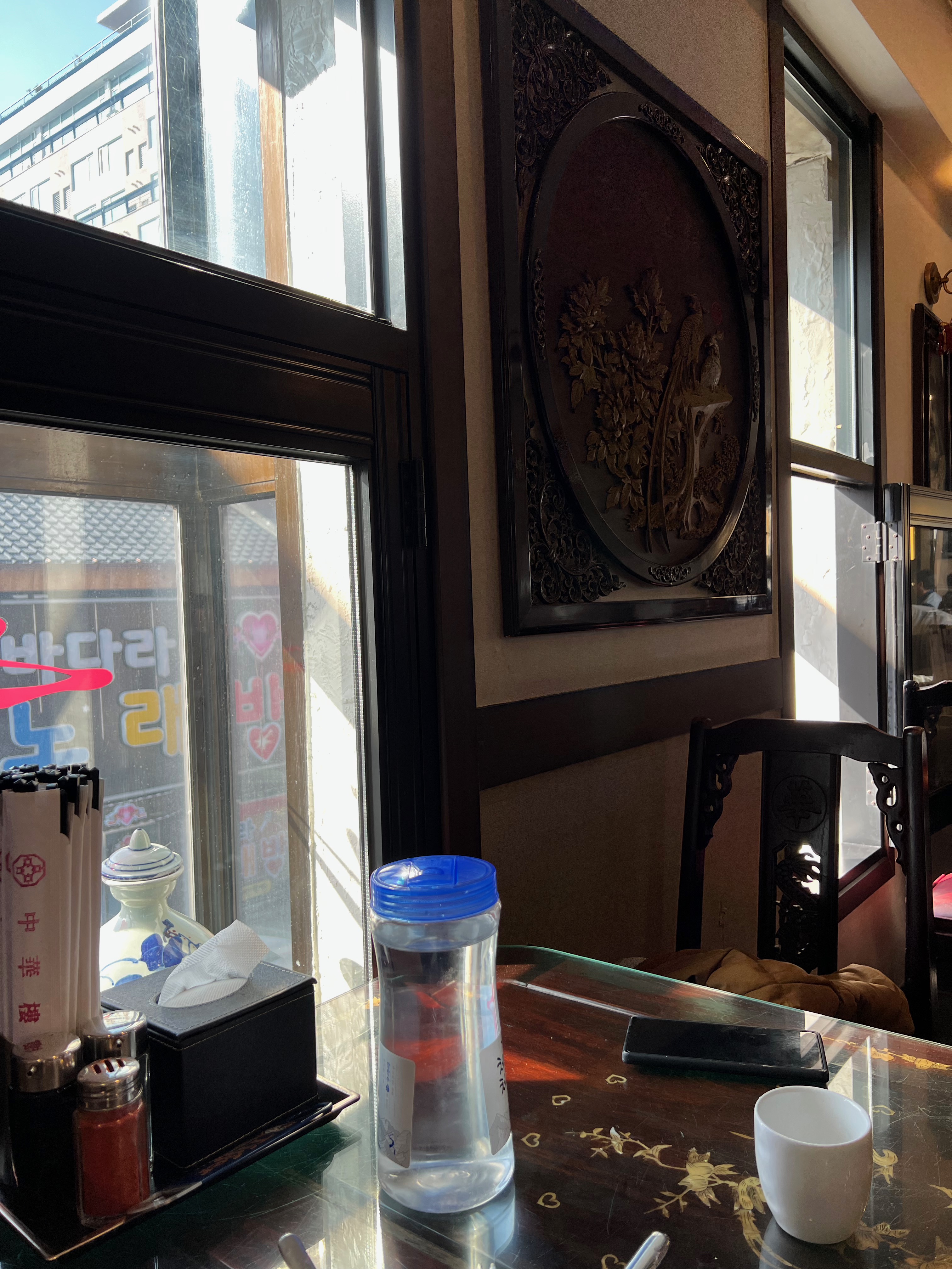 중국스러운 고풍스러운 테이블, 의자, 장식들이 많이 눈에 들어왔습니다.
