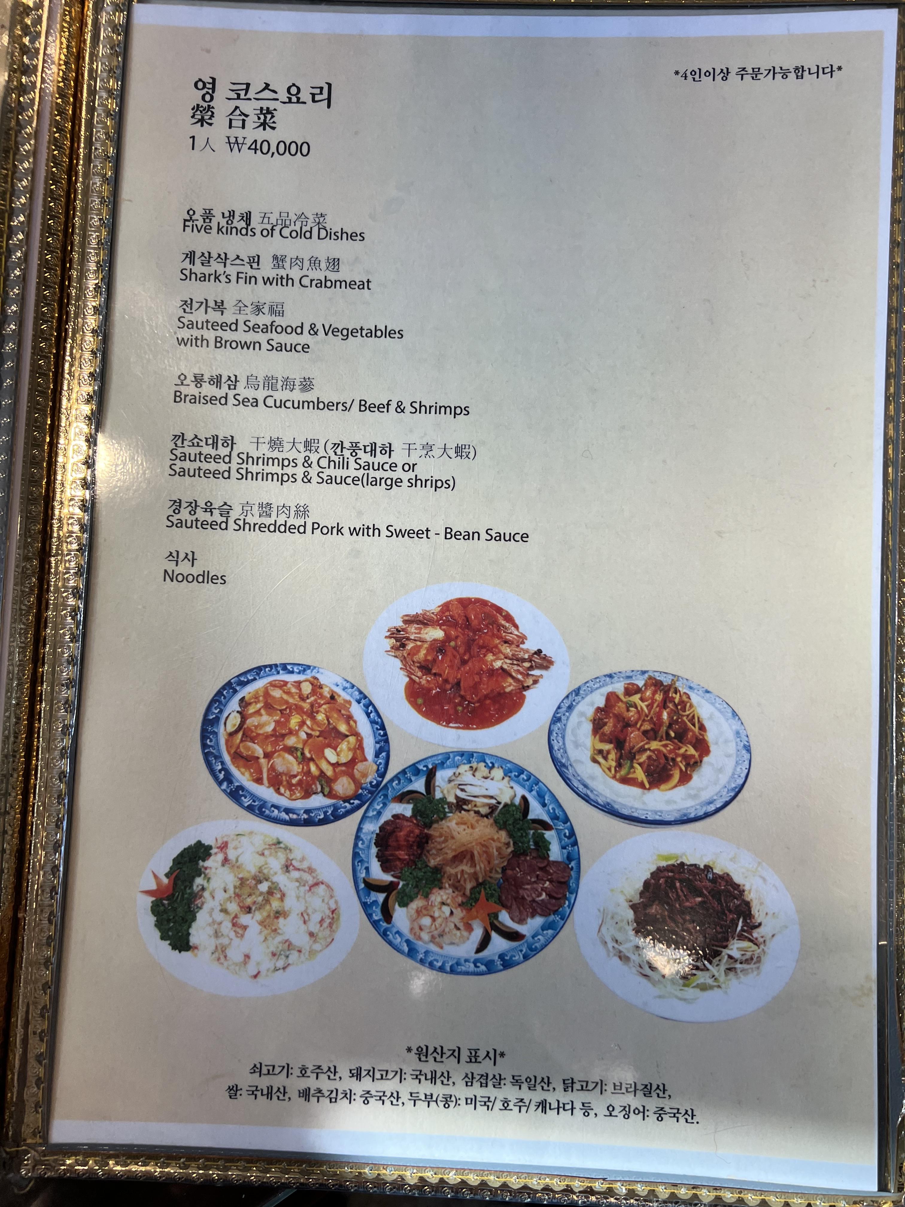 점심이라 짬뽕만 주문했는데.. 메뉴판을 자세히보니 코스요리는 4인이상 주문이 가능했었습니다.