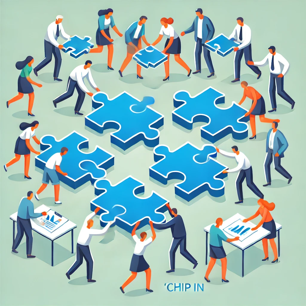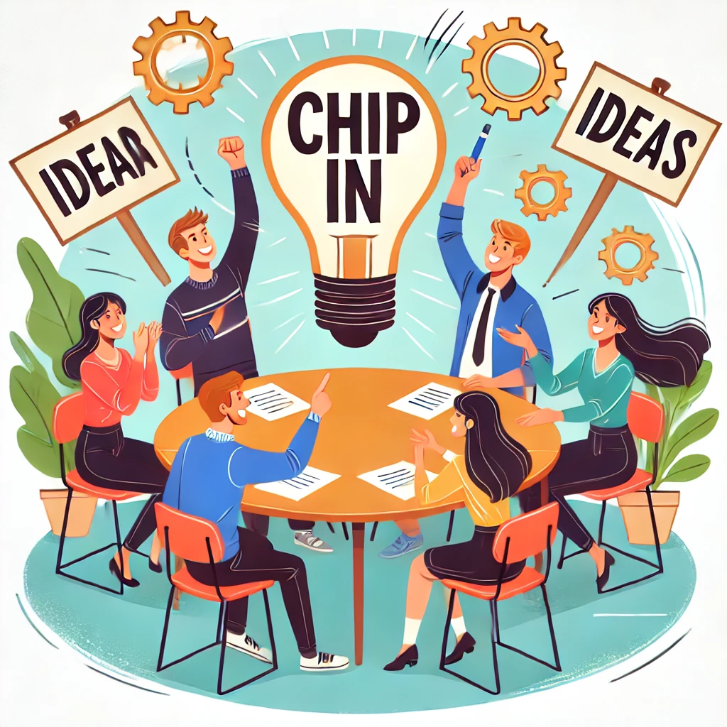 'Chip in'은 여러 사람이 비용이나 노력, 아이디어 등을 조금씩 모아서 함께 참여하거나 기여하는 상황에서 사용합니다.