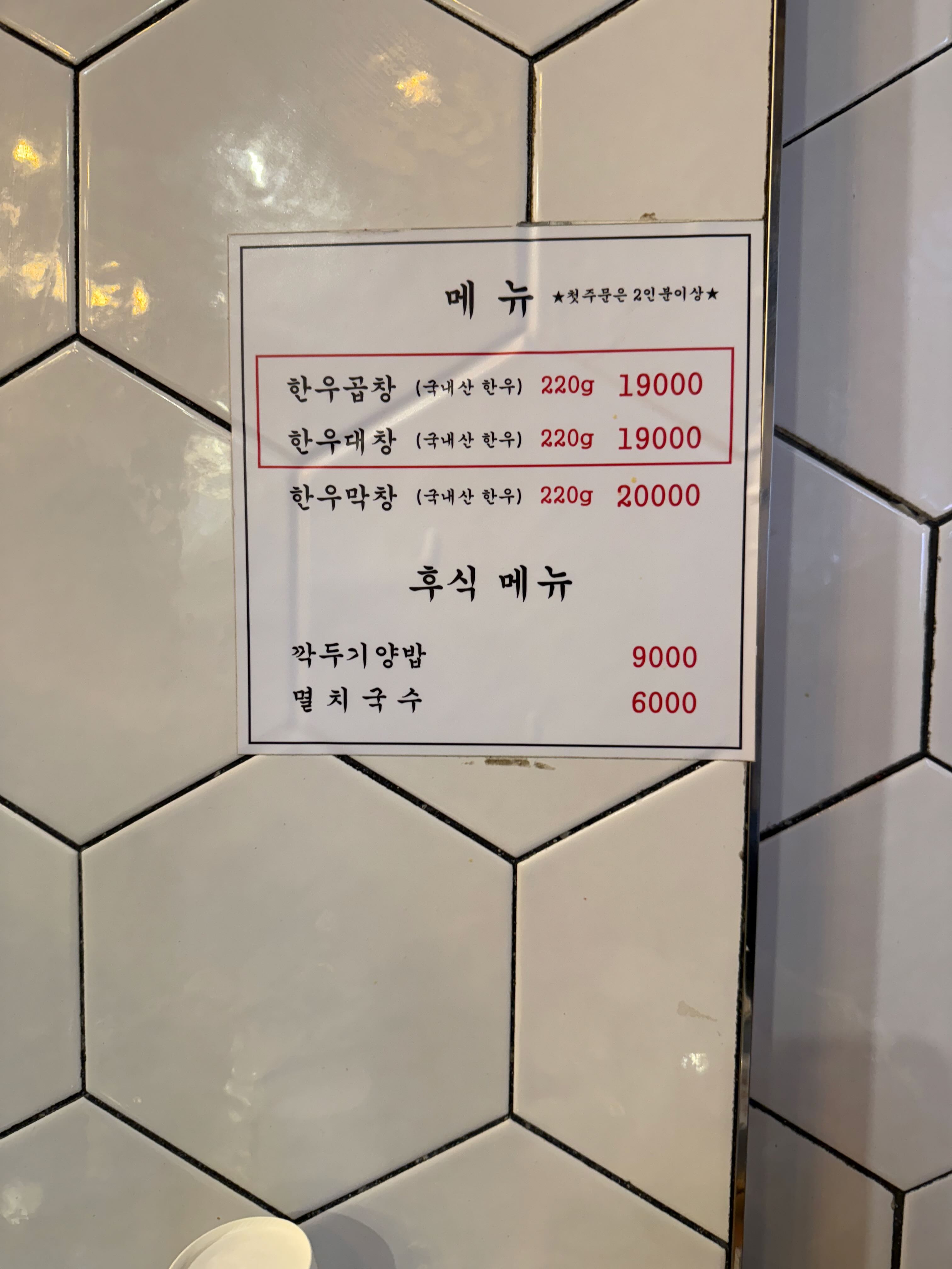 메뉴는 한우곱창, 한우대창, 한우막창, 깍두기양밥, 멸치국수로 딱 깔끔하네요.