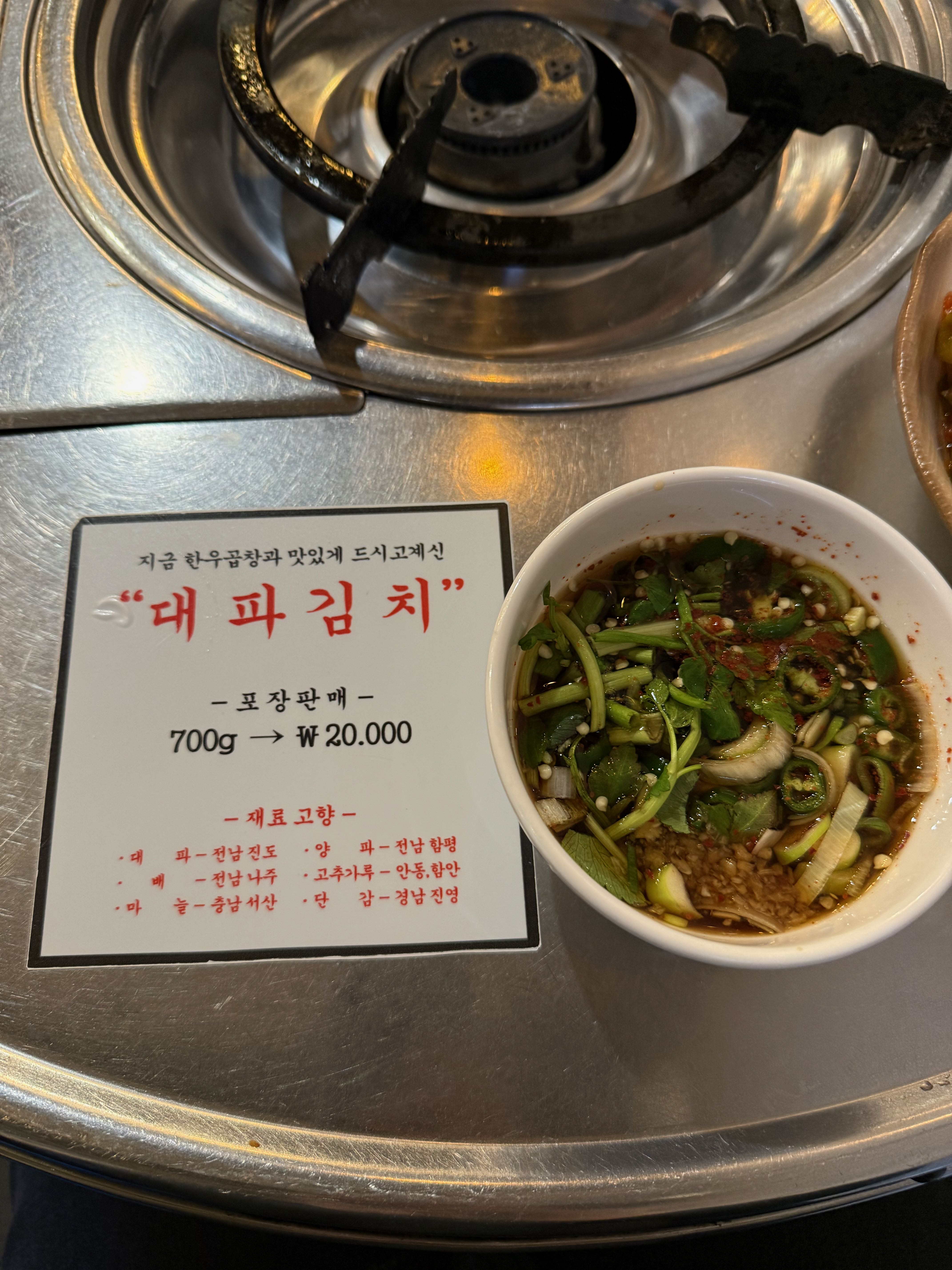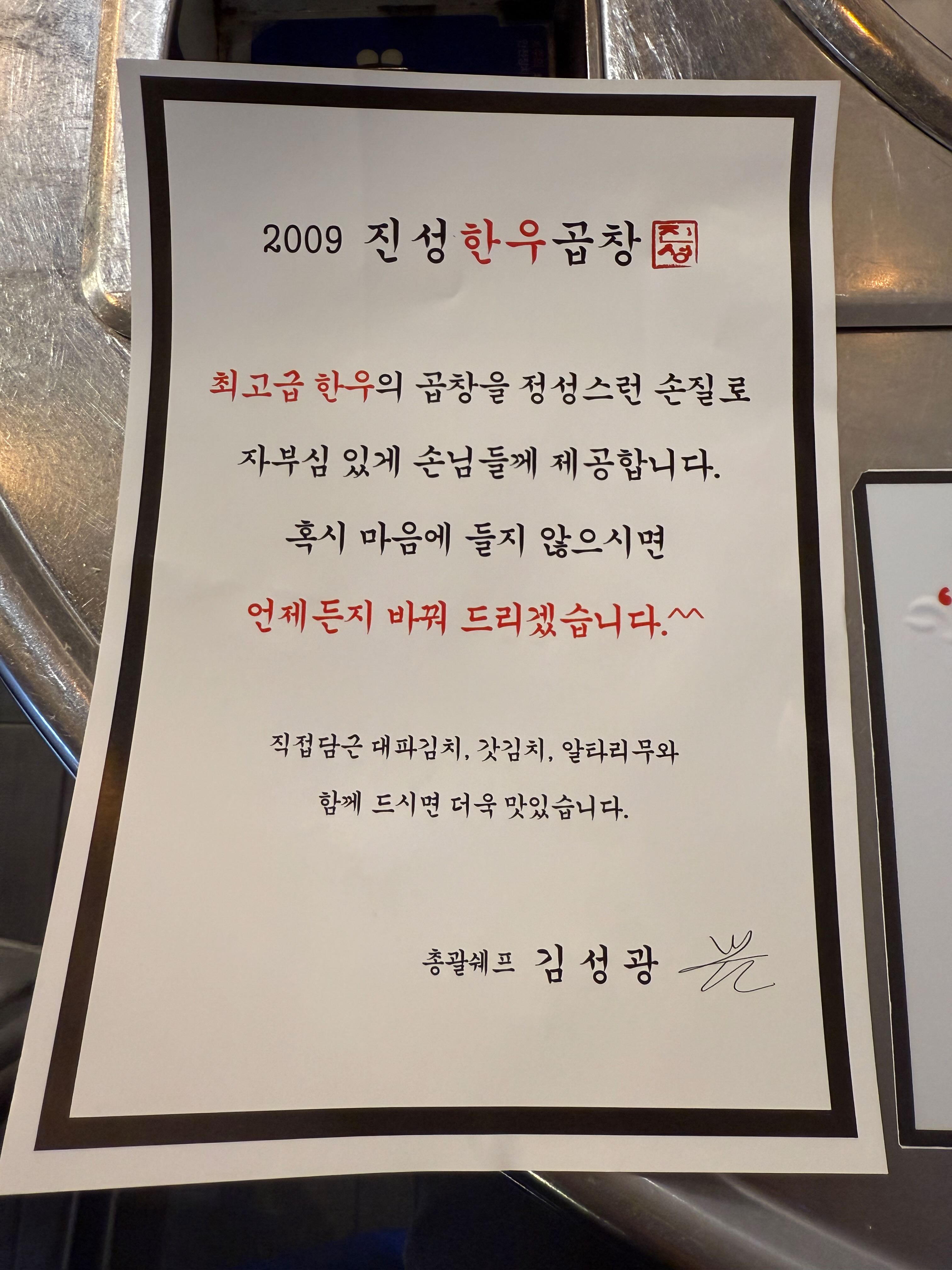 이곳은 곱이 가득한 한우곱창을 직접 담근 대파김치, 갓김치, 알타리무와 함께 먹을 수 있는 곳입니다.