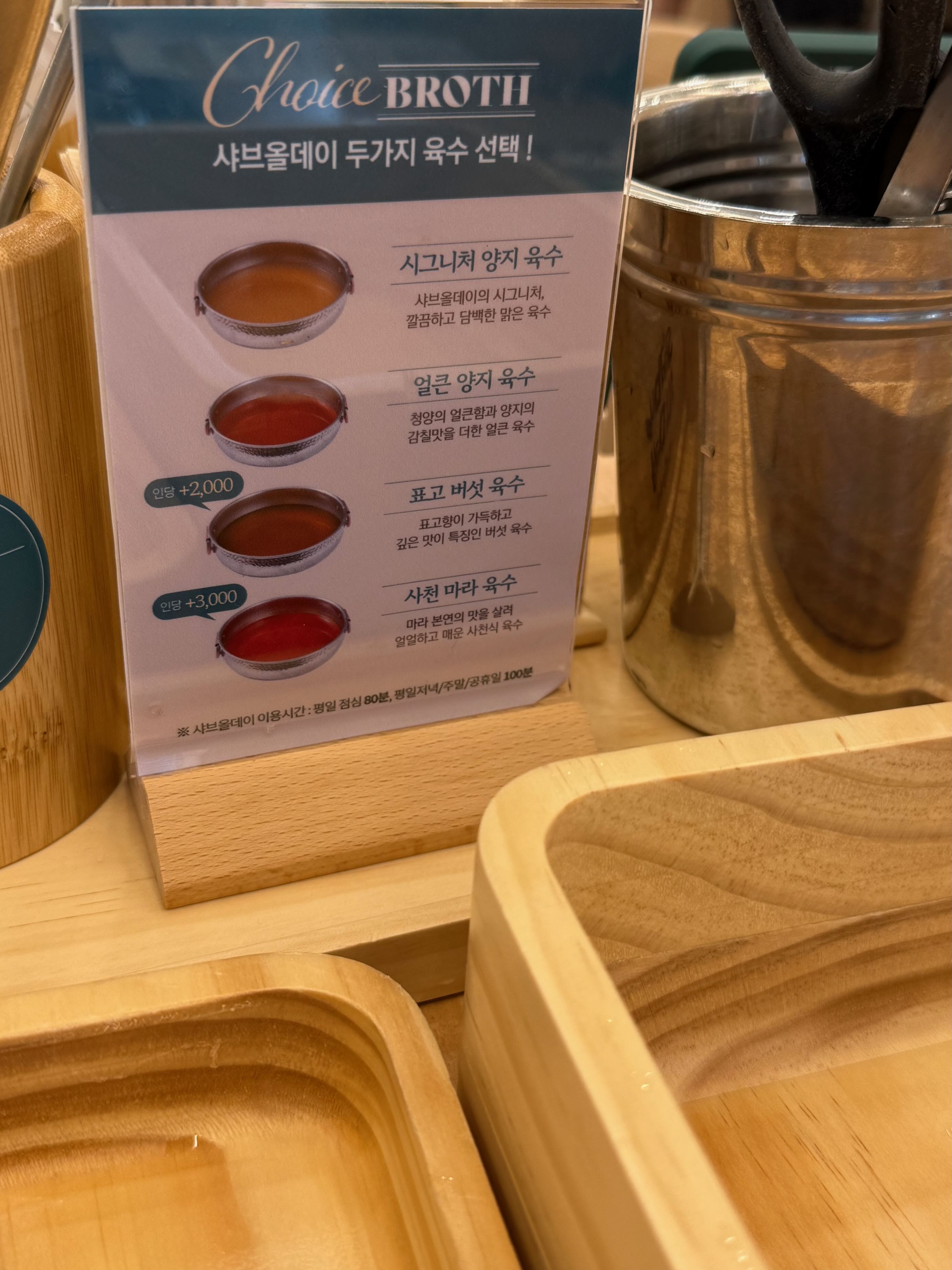 - 육수: 4종류, 반반 육수 선택 가능