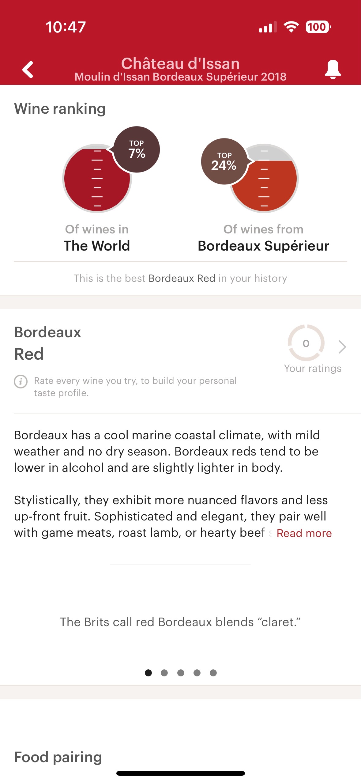 Vivino에 내가 기록한 와인 중에서 제일 좋은 보르도 레드 와인이라고 한다.