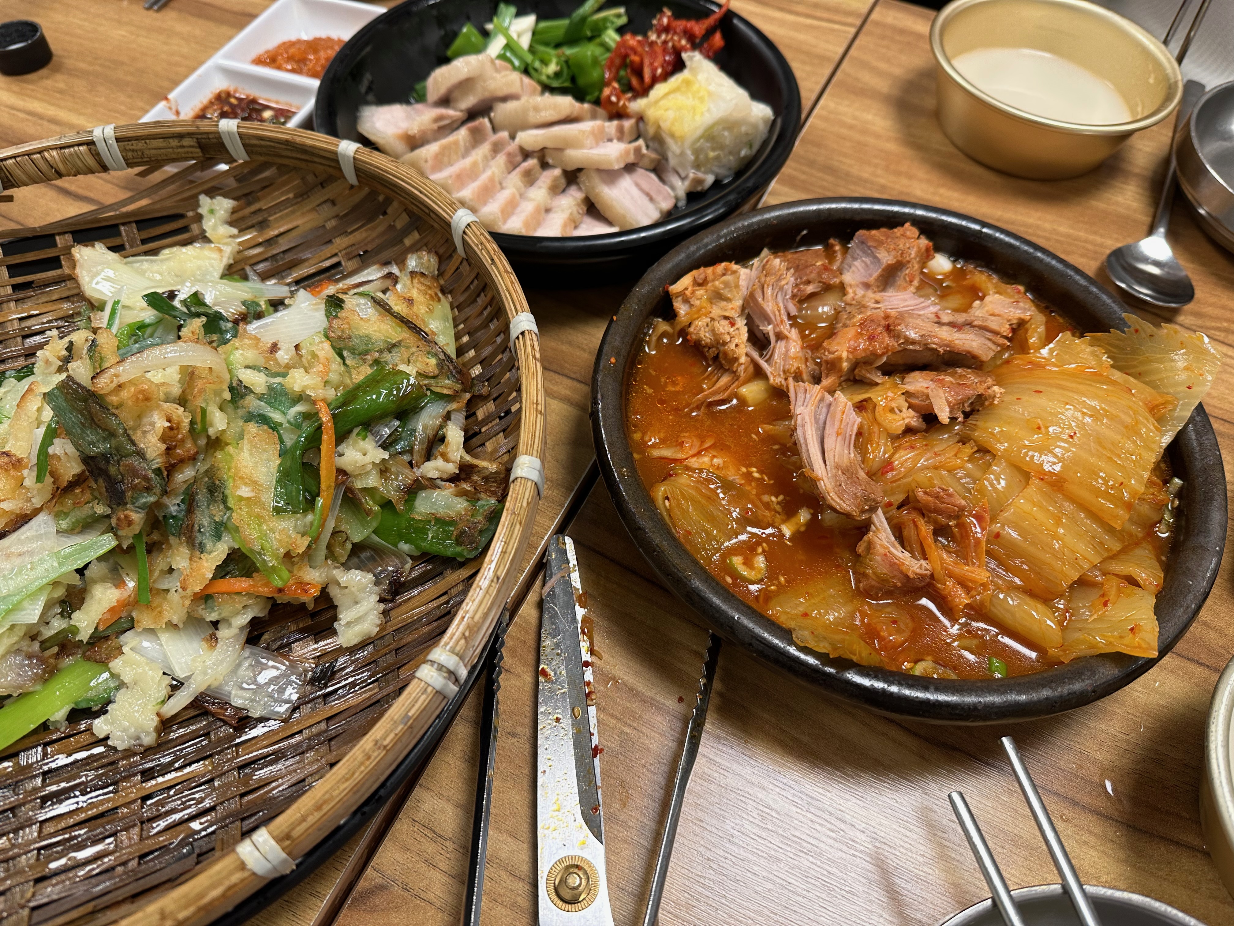 보쌈 + 김치찜 + 대파전 + 막걸리 세트입니다.